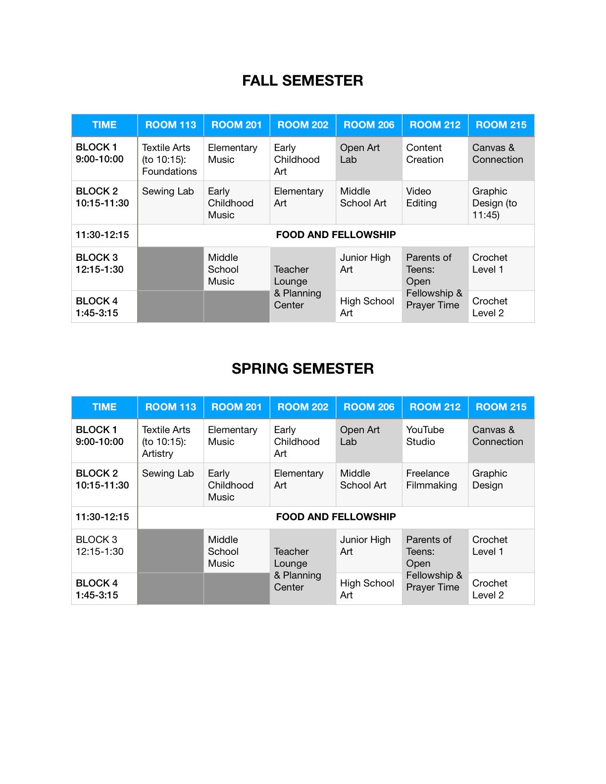 All classes are offered in 16-week semesters. Families may enroll in one or both semesters at the time of registration to guarantee placement for the full year.